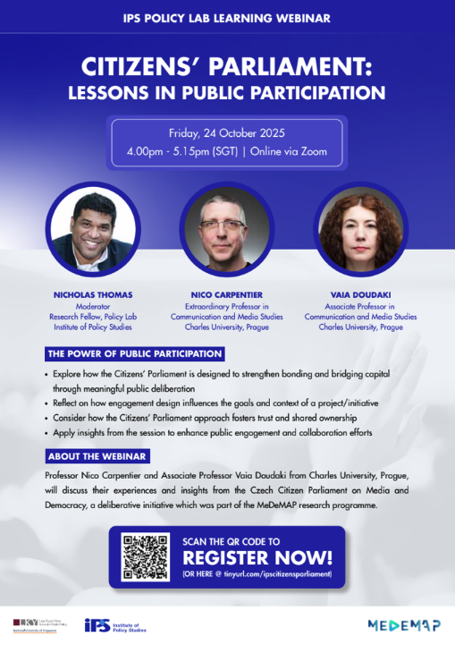 More information about this event can be found here – https://lkyspp.nus.edu.sg/ips/events/details/policy-lab-learning-webinar-citizens–parliaments–lessons-in-public-participation?nocache=1