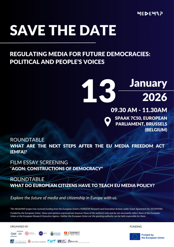The morning event is titled ‘Regulating Media for Future Democracies: Political and People’s Voices’. Members of the European Parliament, national parliamentarians, European Commission officials, and policy actors will discuss the intersection of media regulation and democratic governance. Building on MeDeMAP’s extensive research into European political information environments, two roundtables will explore critical questions about the future of media policy in the EU, including next steps following the EU Media Freedom Act (EMFA) and citizen perspectives drawn from the citizens’ parliaments organised by MeDeMAP in Austria, the Czech Republic, Ireland, and Slovenia. The morning programme will also feature a screening of ‘AGON: Constructions of Democracy’, a thought-provoking film essay that reflects on the meaning of democracy and its contestation across cultures. The event will take place in the European Quarter (final location to be confirmed) between 9.30 am and 11:30 am.